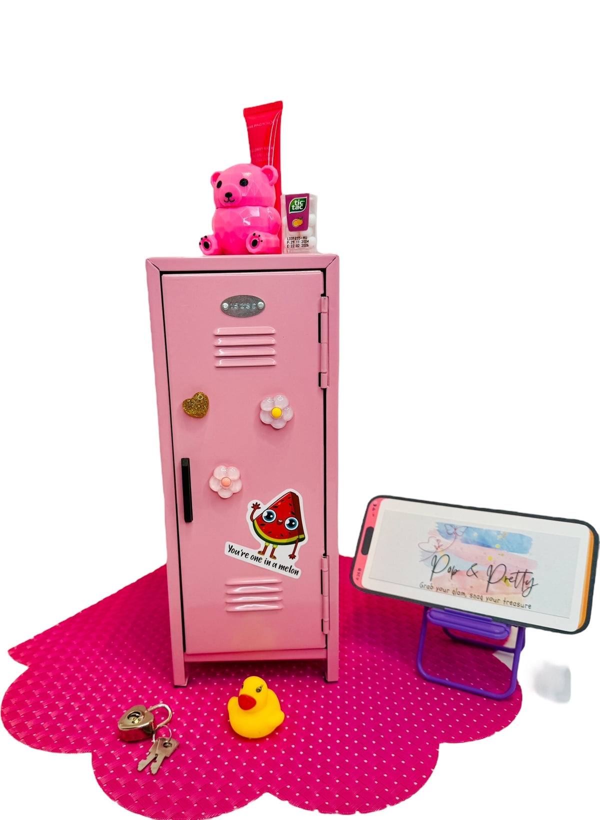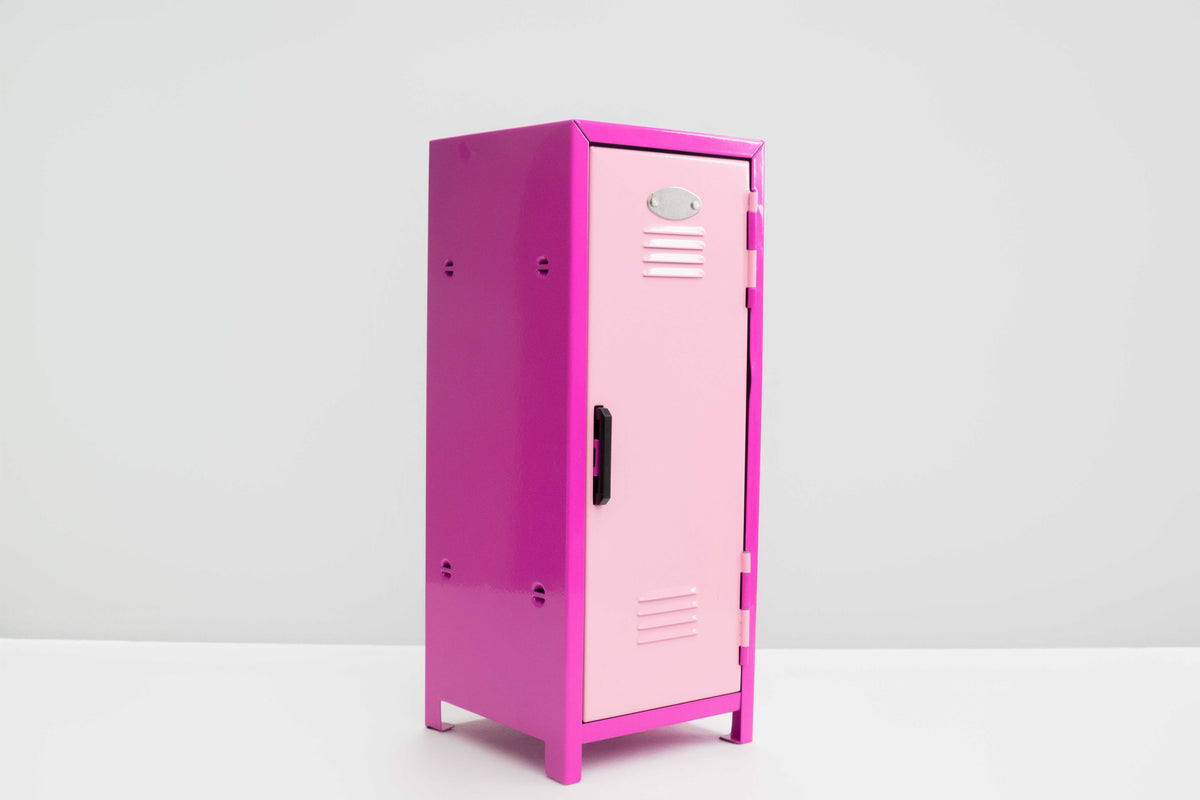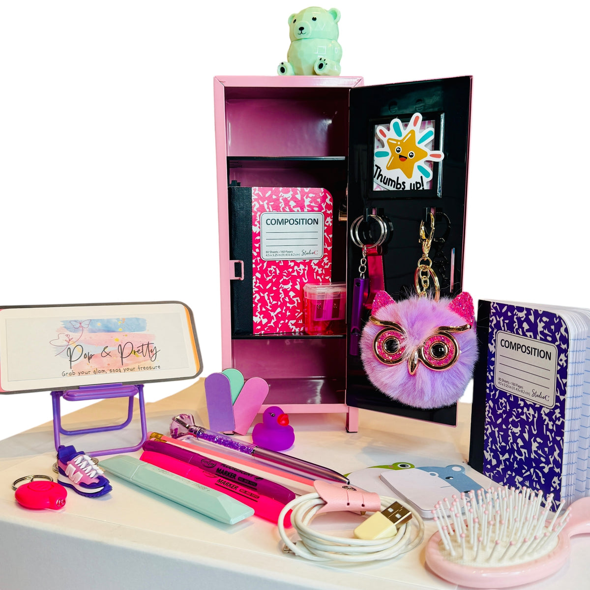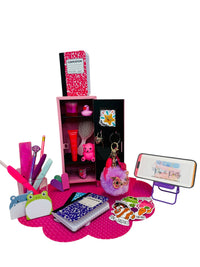 Mini Locker with - 10.8 Inch Metal Storage Lockers, Pink Classic Design, Compact Freestanding Organizer for Home Office, Bedroom, Desktop - No Assembly Required 3 composition nooks, 1 pencil sharpener, 5 stickers, 1 lip balm tube, 1 hair brush, 1 Teddy bear lip balm, 1 tic tac, 1 owl key chain with bottle opener, flash light, whistle, 2 post it notes, 3 highlighters, 2 pencils, 1 diamond pen and 1 ruler. (Cord and Phone Not included)