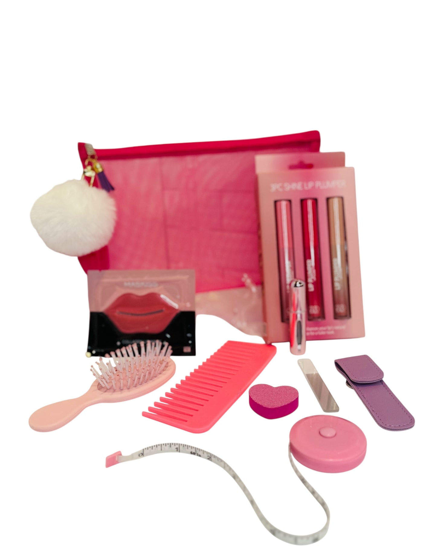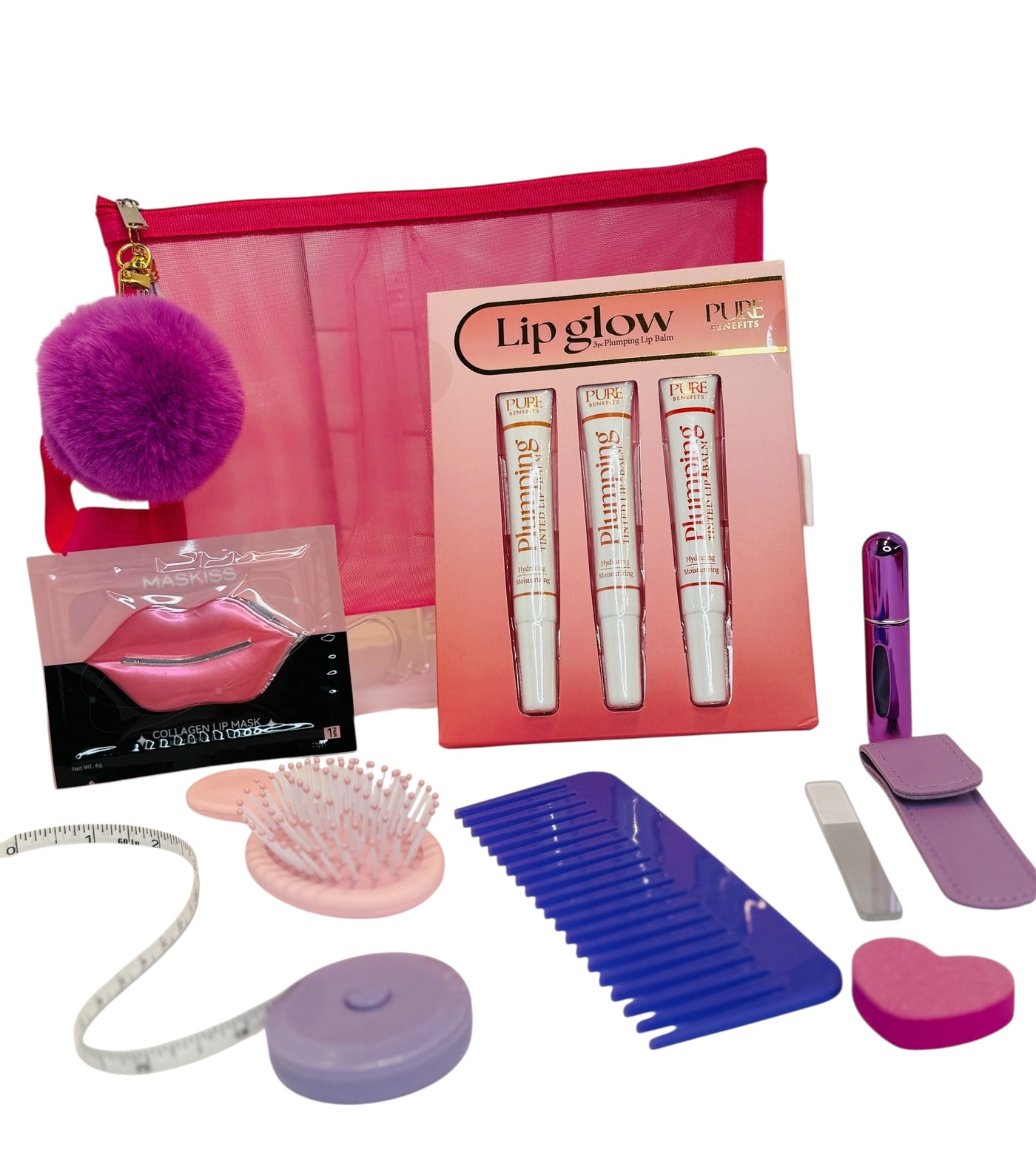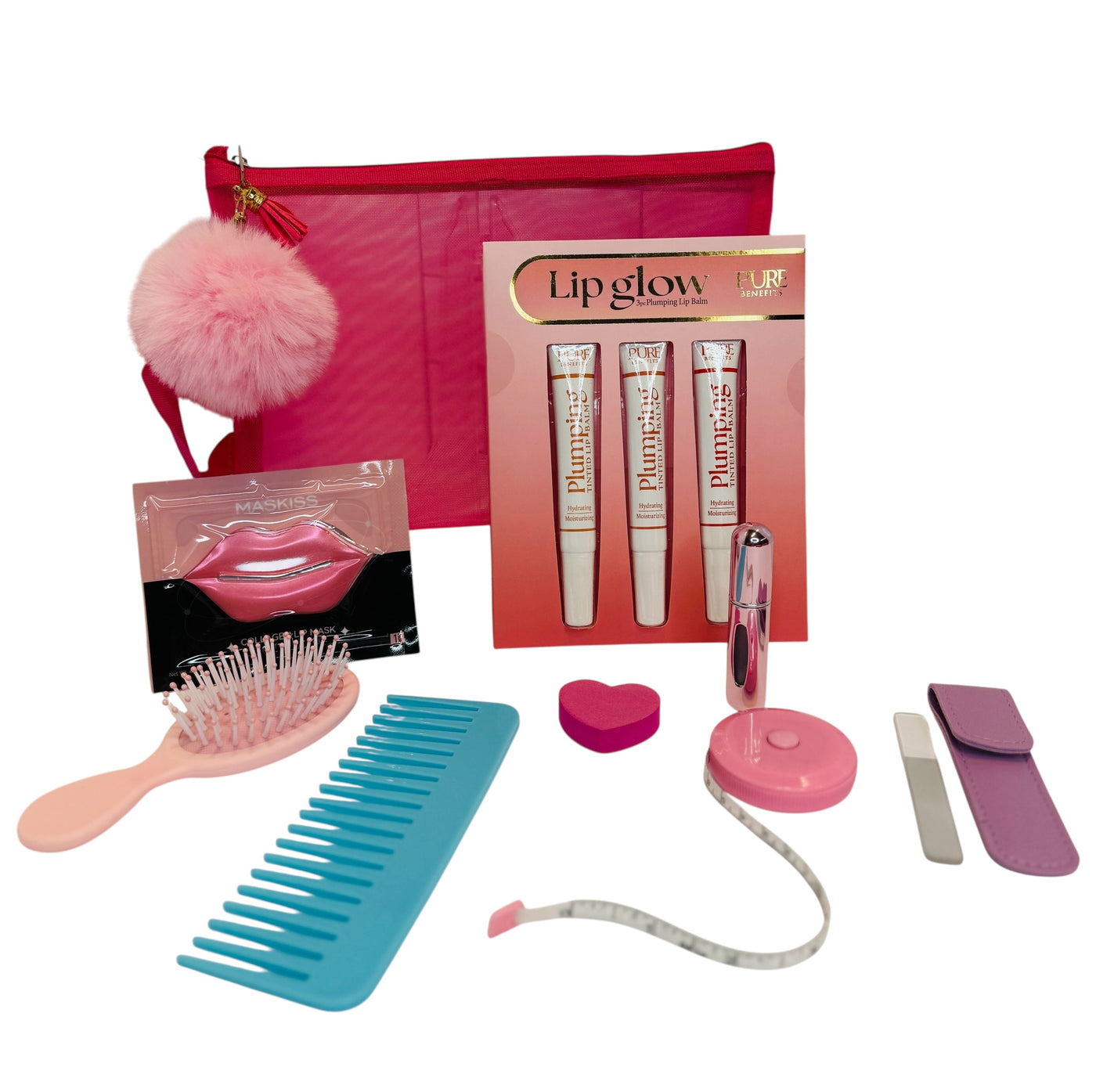Stay prepared and pampered wherever you go with this chic pink mesh bag packed with beauty must-haves. This travel-friendly kit includes a vibrant mesh pouch with a fluffy pom-pom charm, a 3-piece lip plumper balm set, collagen lip mask, compact hairbrush, wide-tooth comb, perfume atomizer, nail file in a protective sleeve, measuring tape, and a heart-shaped sponge. Perfect for gifting or keeping in your purse, gym bag, or suitcase, this set combines style, convenience, and self-care in one adorable package.