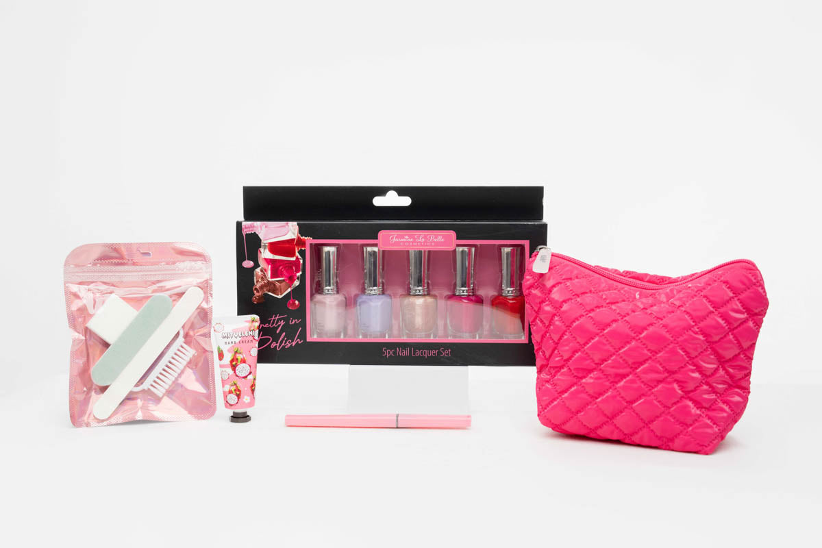 Classic Style quilted cosmetic bag with Pom Pom Charm. With 5 piece Nail lacquer set, Hand cream, Nail files