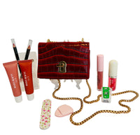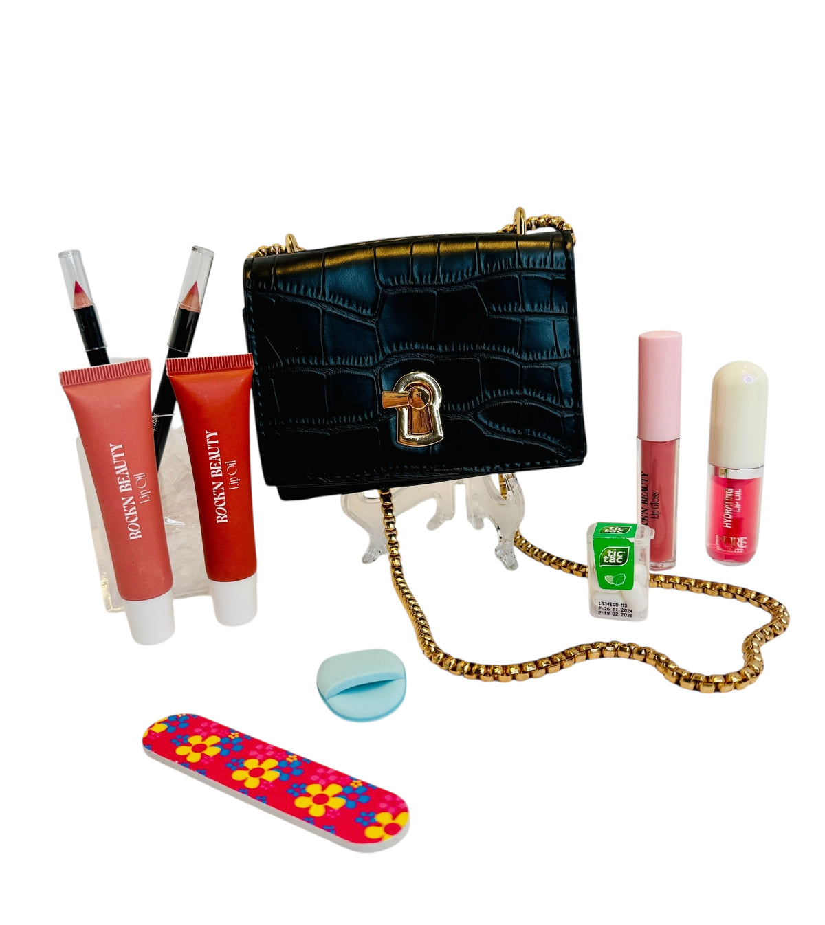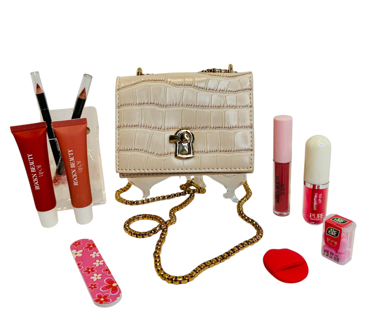 A stylish mini crossbody bag paired with a curated selection of lip essentials for an effortlessly chic look. This set includes two creamy lip pencils, two nourishing lip oils, and two high-shine lip glosses, and tic taps, perfect for creating versatile day-to-night styles. Finished with a gold chain strap, the compact bag adds a touch of elegance while keeping your beauty must-haves within reach.