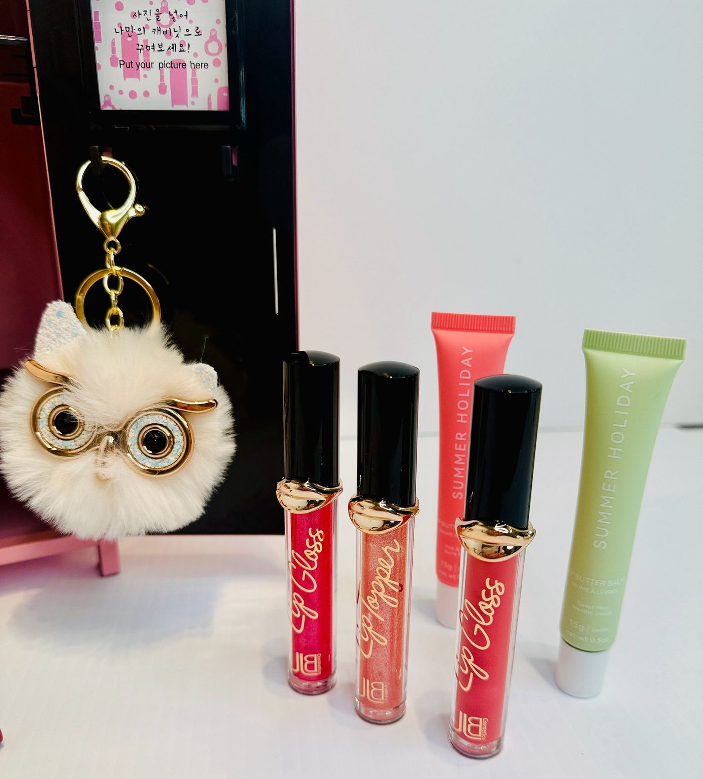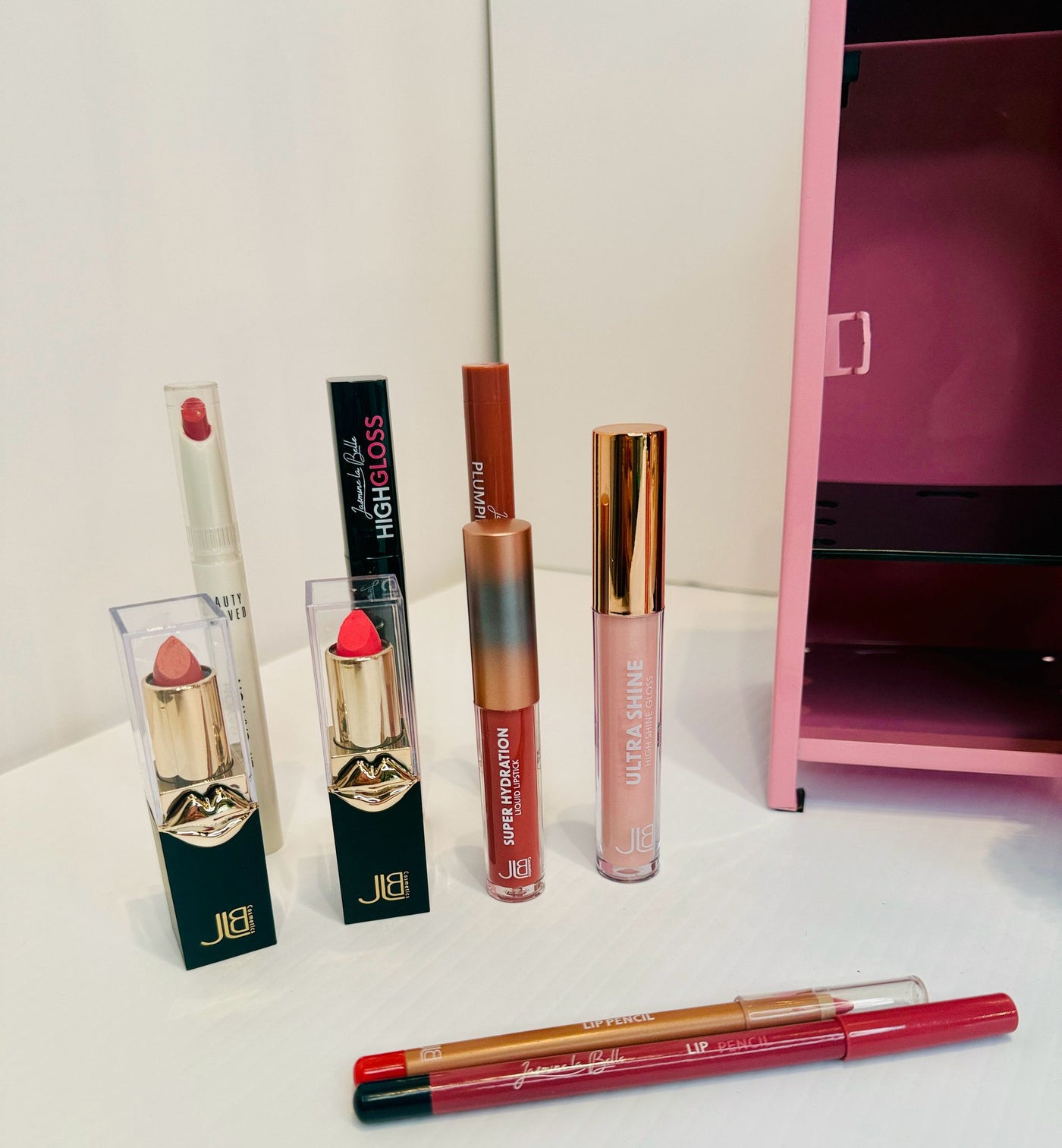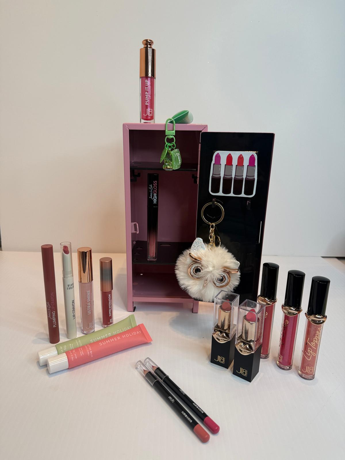 INCLUDED: 2 JLB Lipsticks, 3 JLB Lipstick Toppers, 1 Lip gloss with charms, 1 High gloss by Jasmine La Belle, 1 JLB Pump It Up Lipgloss, 1 Plumper, 1 Lip Crayon, 1 JLB Ultra Shine Lipstick, 1 JLB Super hydrate lip gloss, 2 Summer Holiday Lip Butter, 2 Lip Liners
