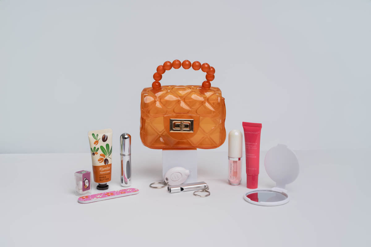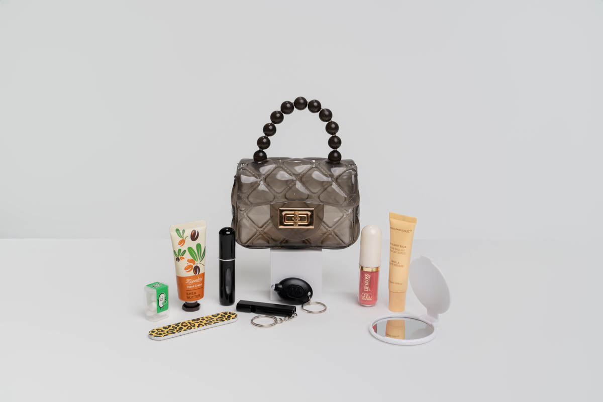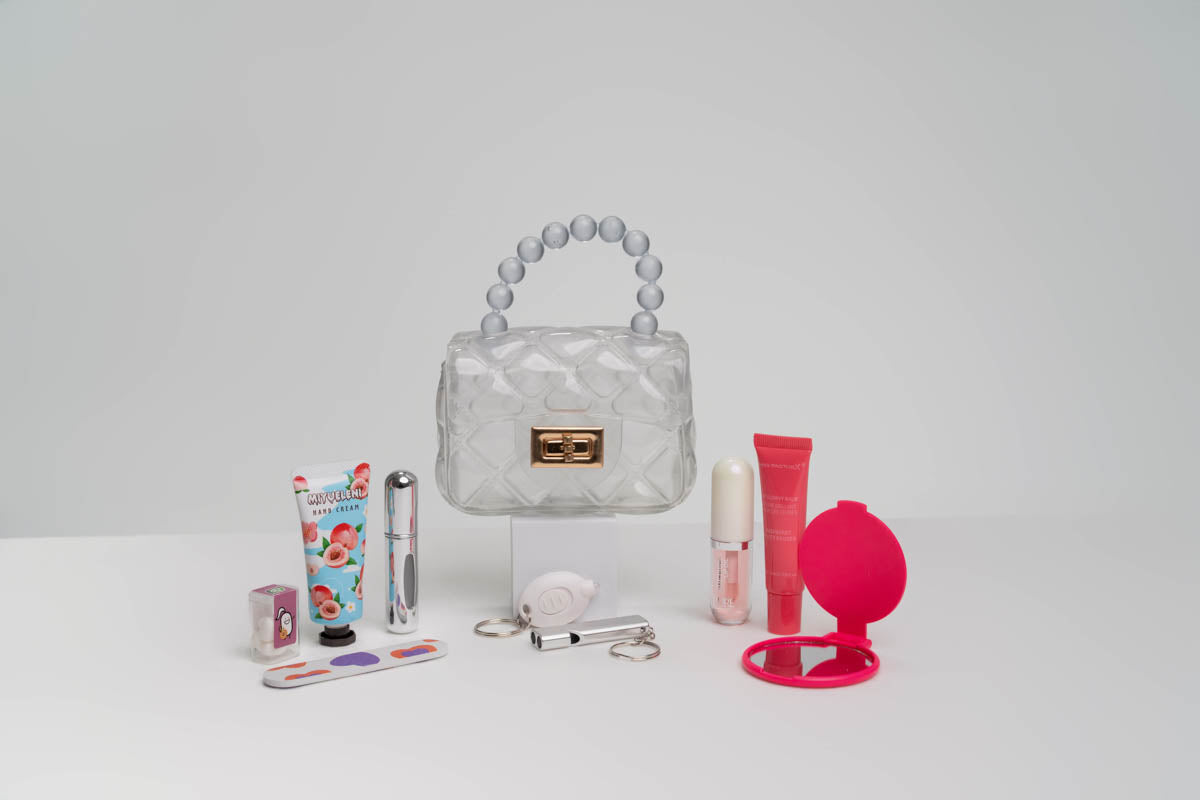 This set features a chic, clear quilted mini handbag with a round pearl-style handle and gold clasp closure, paired with a collection of beauty essentials. Inside, you’ll find a selection of stylish and practical items: