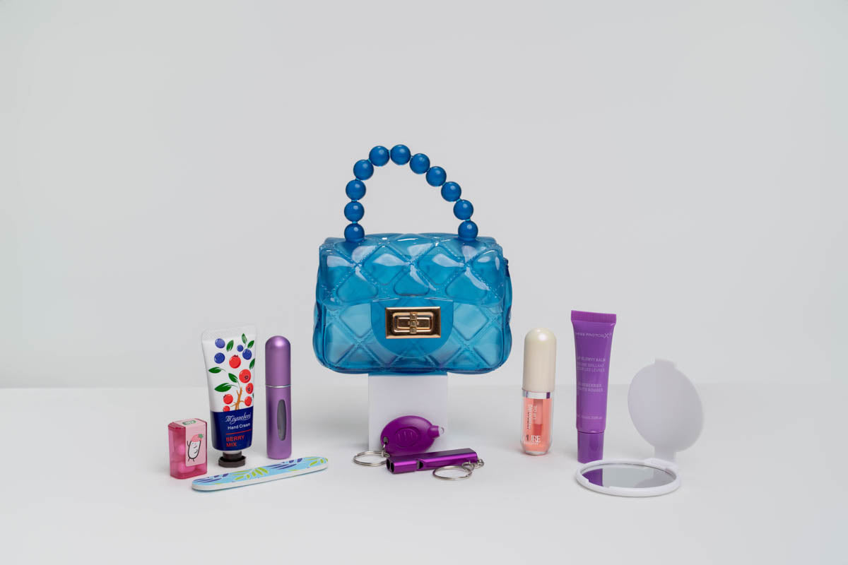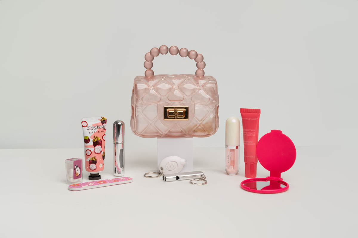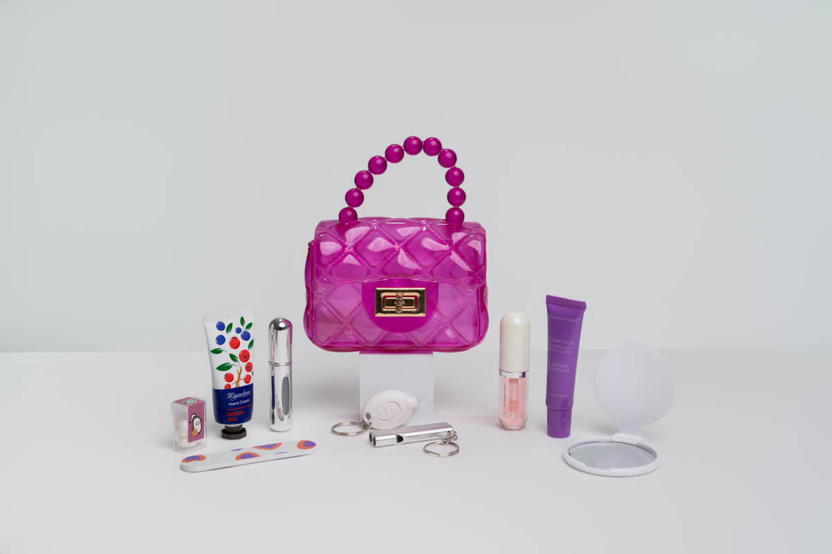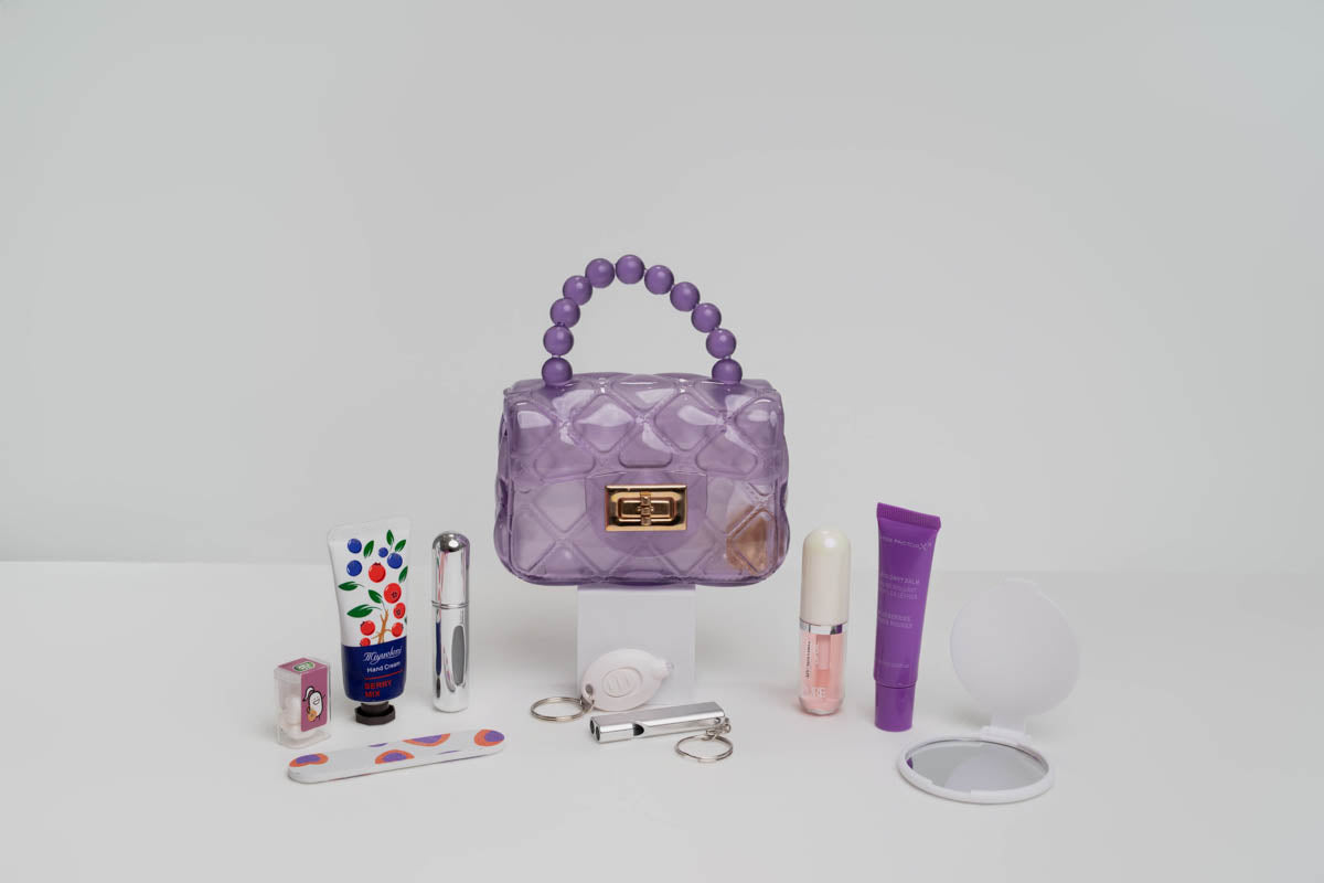 This set features a chic, clear quilted mini handbag with a round pearl-style handle and gold clasp closure, paired with a collection of beauty essentials. Inside, you’ll find a selection of stylish and practical items: