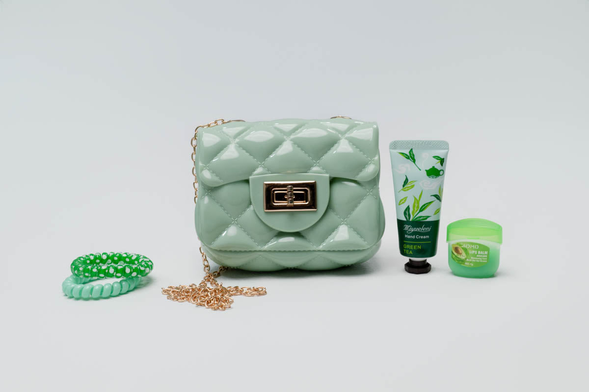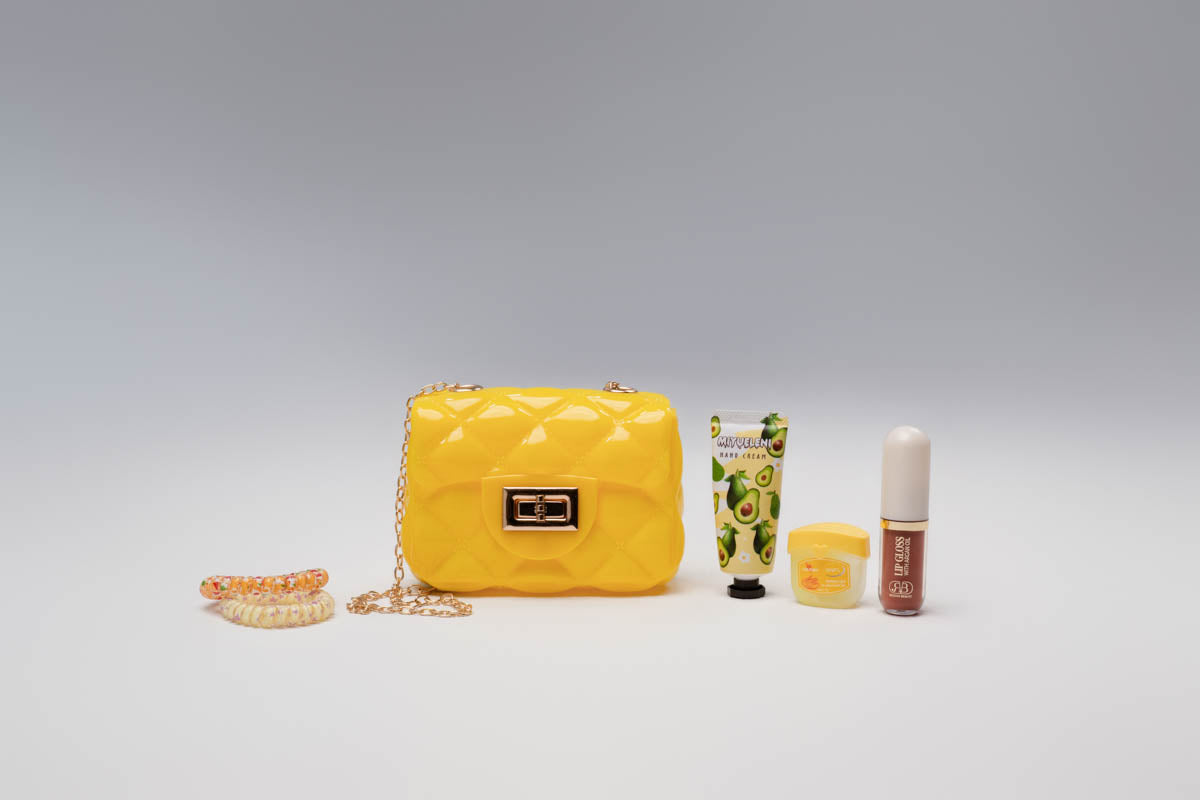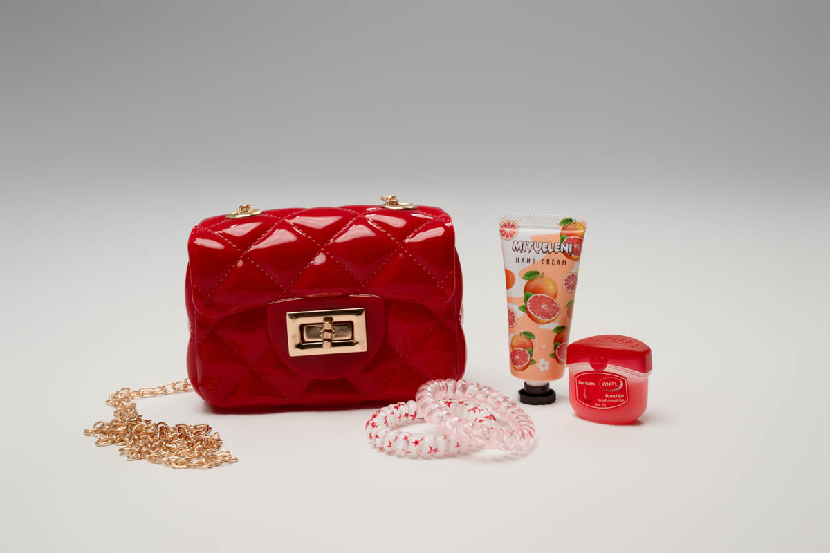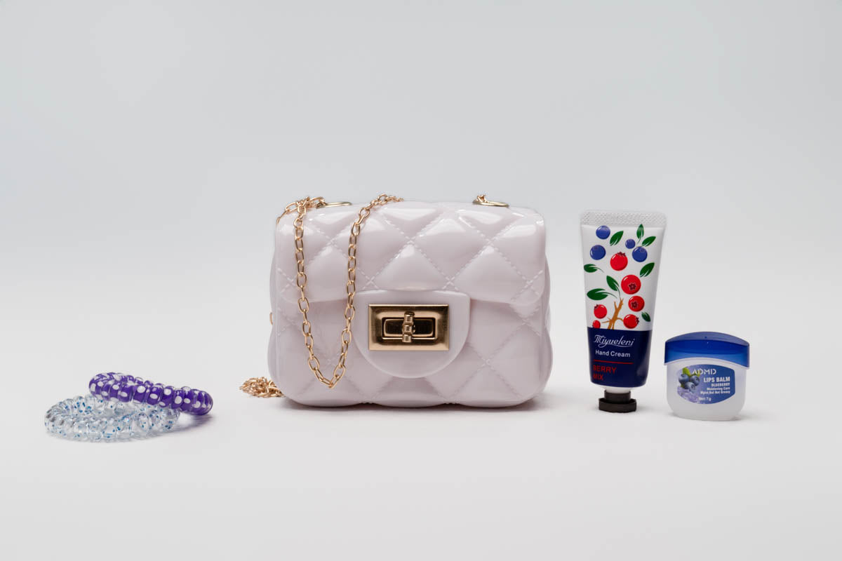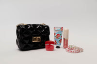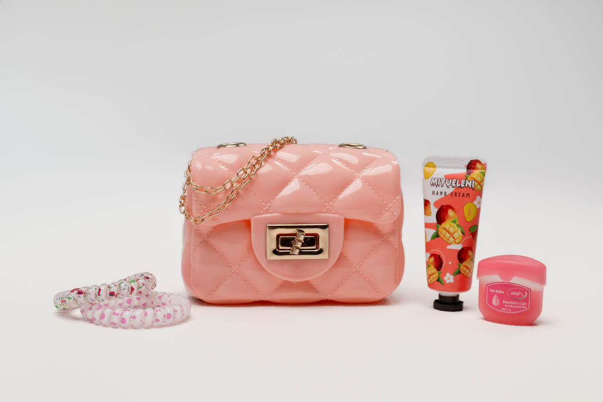 Mini Square quilted hand bag with hand cream, Lip Gloss, elastic bands and lip balm.