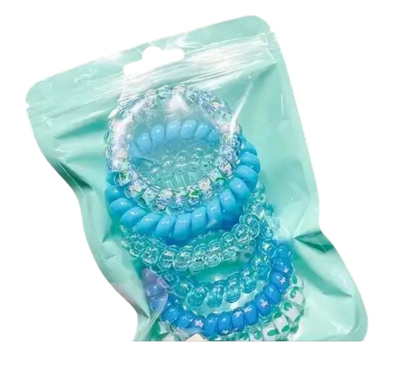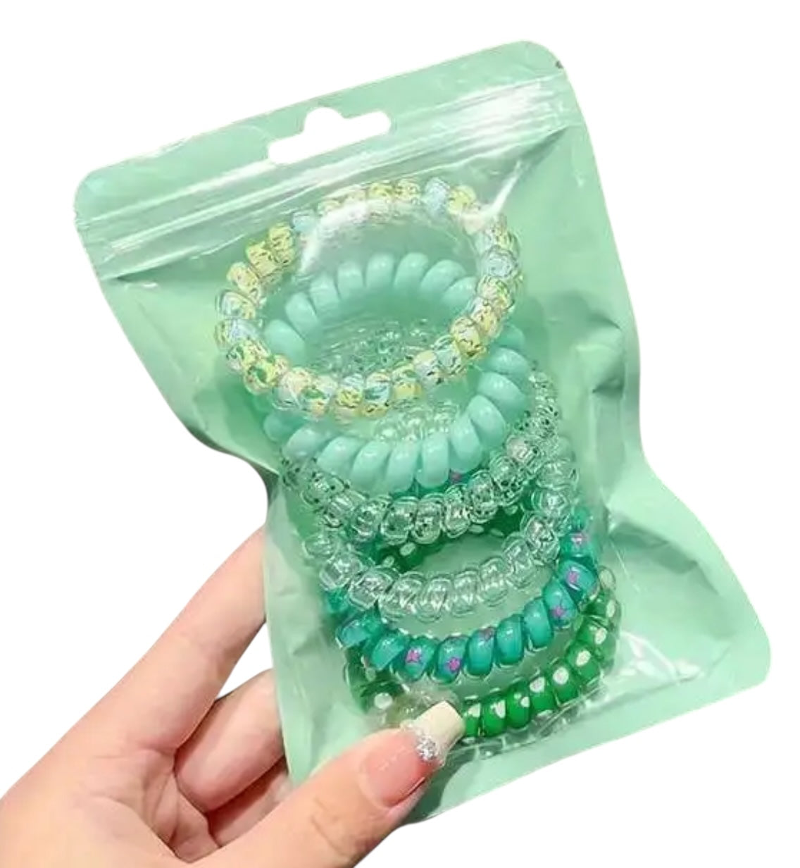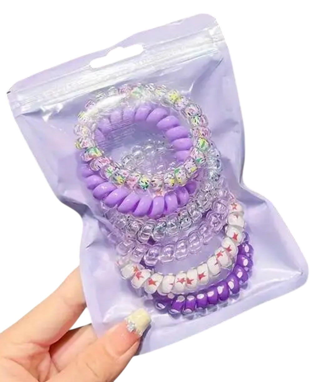 • Colorful, coiled hair ties (telephone wire style)