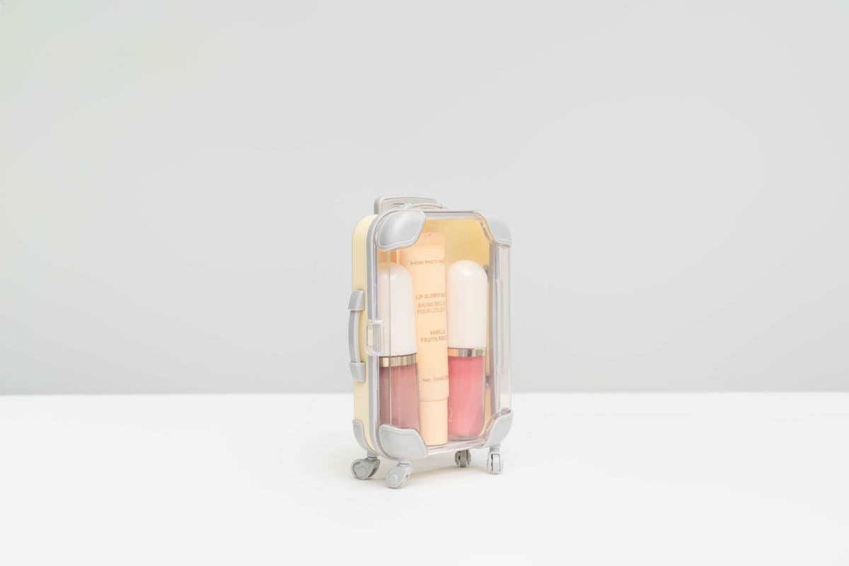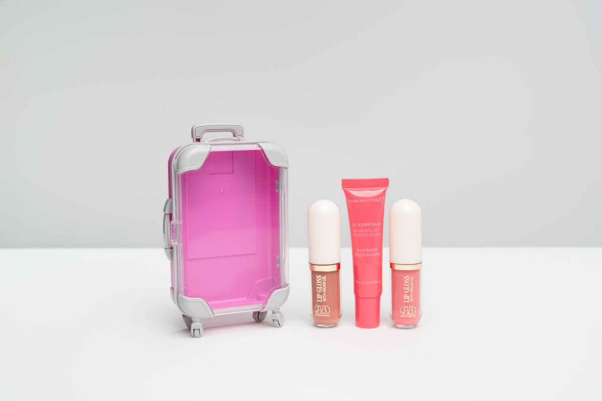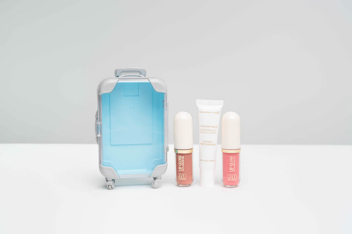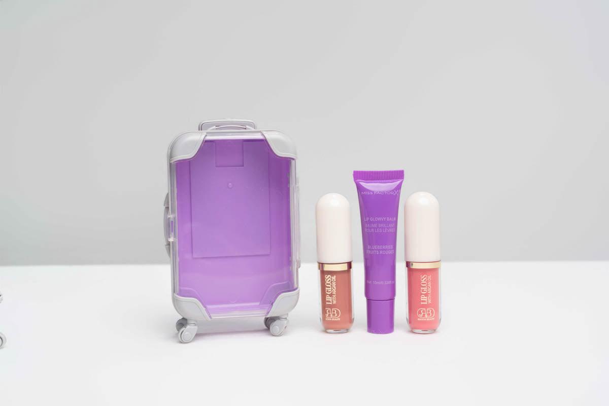 Rolling Mini-Suitcase – includes PURE Hydrating lip oil, Miss Factorx Lip Gloss and Rock and Beauty Lip Gloss. SO darn cute.